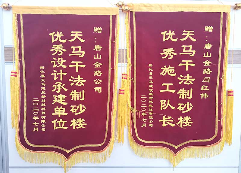 近日,天馬建筑項(xiàng)目負(fù)責(zé)人將兩面印有“天馬干法制砂樓,優(yōu)秀設(shè)計(jì)承建單位”、“天馬干法制砂樓,優(yōu)秀施工隊(duì)長(zhǎng)”的錦旗送到了唐山金路安裝隊(duì)長(zhǎng)閆紅偉的手上。